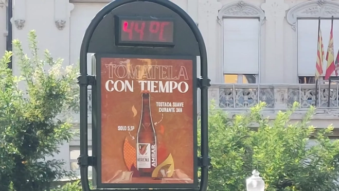La calle Zaragoza está calentita, pero aún queda lo mejor. La Plaza de Navarra. Ahí, en un acto de osadía, prácticamente de ardor -nunca mejor dicho- guerrero, nos aproximamos hasta la esquina de la Granja Anita con una canción que recuerda que hace calor. Y ahí la aparición (en la imagen): 44º del alta y debajo un anuncio de Ámbar con un consejo: Tómatela con tiempo. Y añadiríamos que a tiempo. Providencial. Hay que hidratarse.