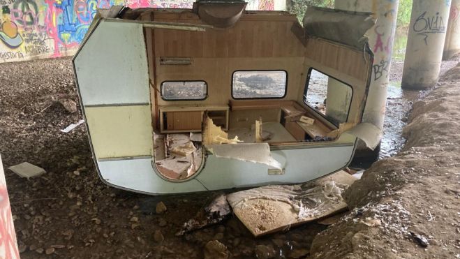 La caravana no tiene ruedas, le falta uno de sus laterales y contiene restos de algún viejo colchón. El lugar del cauce donde se halla se encuentra ahora prácticamente seco.