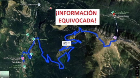 Como recuerda el Gobierno aragonés, la carretera de acceso desde el Puente de los Navarros está abierta, como informó recientemente el Parque Nacional de Ordesa y Monte Perdido, mientras que la indicación de Google Maps indica que está cortada.