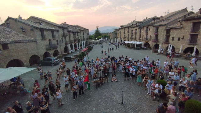 Vecinos de Aínsa y localidades cercanas se dieron cita en la Plaza Mayor de la villa para mantener la presión en su intento de frenar el genocidio en Gaza. Durante la concentración, Alkarama realizó un llamamiento a la solidaridad con las mujeres palestinas, “y en primer lugar, con las mujeres de la Franja de Gaza, que cada día enfrentaban el genocidio, el hambre y el desplazamiento bajo el fuego de la ocupación sionista y las bombas de Estados Unidos y Europa”.