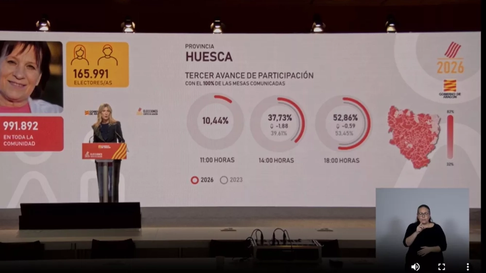 La vicepresidenta del Ejecutivo aragonés, Mar Vaquero, ha informado de que, en el conjunto de la comunidad, la participación ha alcanzado el 56,28 %, lo que supone 1,55 puntos más que en los comicios de 2023, cuando a esa misma hora se situó en el 54,73 %. En su comparecencia, Vaquero ha subrayado que la jornada se está desarrollando “con la misma tranquilidad y normalidad con la que se inició la apertura de los colegios electorales”, y ha destacado que este desarrollo “es un gran síntoma para nuestra democracia”.
