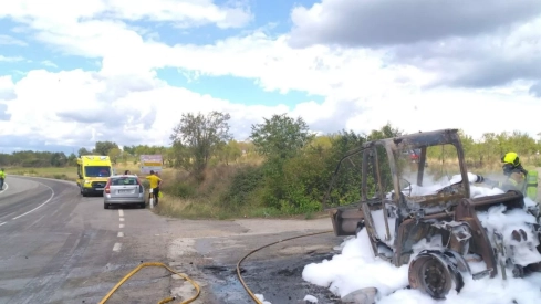 Dos vehículos se han visto implicados este domingo en un accidente en el kilómetro 23 de la carretera A-138, a la altura de Abizanda. Una retroexcavadora que circulaba por un camino se ha detenido y ha comenzado a combustionar de manera espontánea.