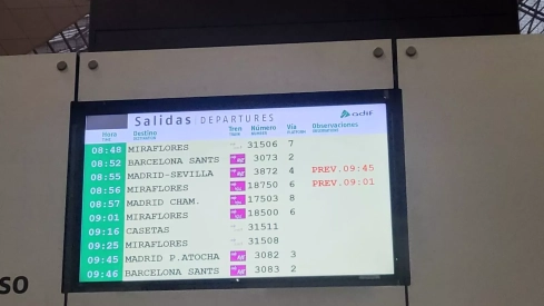 El AVE Huesca-Madrid-Sevilla, unidad número 3872, acumula cincuenta minutos de retraso en Zaragoza si no hay incidencias en el trayecto. Así lo delata la pantalla de información en la Estación de Delicias a las 8:48 horas, cuando quedan siete minutos para la salida prevista hacia la capital de España desde la aragonesa y, sin embargo, a la derecha en el apartado de Observaciones aparece la siguiente leyenda: "Prev. 09:45". Desde las 8:55, contemplada, los aludidos 50 minutos.