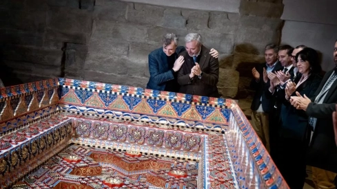 El acto sirvió para dar a conocer el cuarto de los doce alfarjes que existieron en la Sala Capitular, una recreación impulsada por Juan Naya y su equipo dentro del proyecto ‘Sigena Mágica’. En el trabajo han participado seis artesanos, dirigidos por el maestro Paco Luis Martos, Premio Nacional de Artesanía, tras más de un año de elaboración del artesonado.