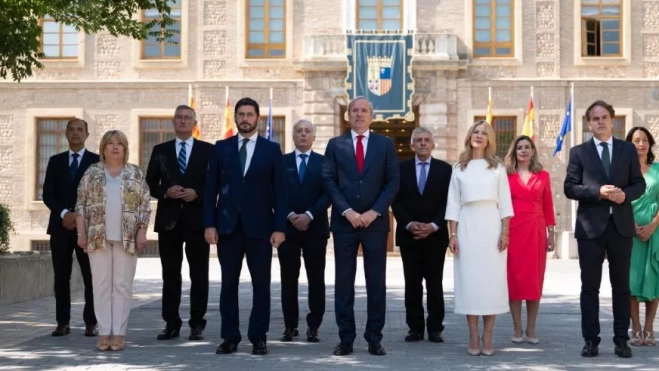 Jorge Azcón ha presidido este sábado la toma de posesión de los 10 nuevos consejeros del Gobierno de Aragón en la Sala de la Corona del Edificio Pignatelli al que han asistido alrededor de 200 personas. En su intervención, el presidente ha fijado su principal horizonte como gobierno: “Que cada medida y cada acción persiga un avance y un crecimiento social y económico; resuelva un problema; y piense en aumentar el bienestar de las familias y en ofrecer más oportunidades a las personas en un Aragón más libre, más justo y más solidario”.
