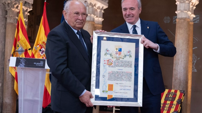 “En nombre de los aragoneses, querido Javier, gracias infinitas por tu trabajo, tus anhelos y tus desvelos”, ha sostenido el presidente aragonés hacia su antecesor, quien minutos antes ha recibido de manos del mandatario la Medalla de Aragón.