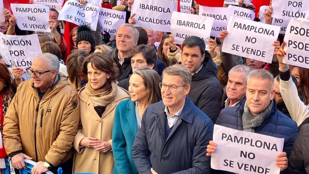 El presidente de Aragón, Jorge Azcón, participa en la manifestación contra la moción de censura en Pamplona perpetrada por Bildu y el PSOE, presencia que ha calificado como "una obligación moral como es estar aquí, respaldando al pueblo navarro en algo que es absolutamente inconcebible hasta hace poco tiempo, como es que el Partido Socialista esté dispuesto a pactar con los herederos de los asesinos para darle una alcaldía tan importante como es la de Pamplona".