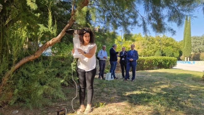 Por su parte, la profesora asociada de Patología Animal de la la Facultad de Veterinaria de la Universidad de Zaragoza, Sara Lacour, ha explicado cómo funciona una trampa para vectores, acto que se ha celebrado en el Parque Delicias de Zaragoza.