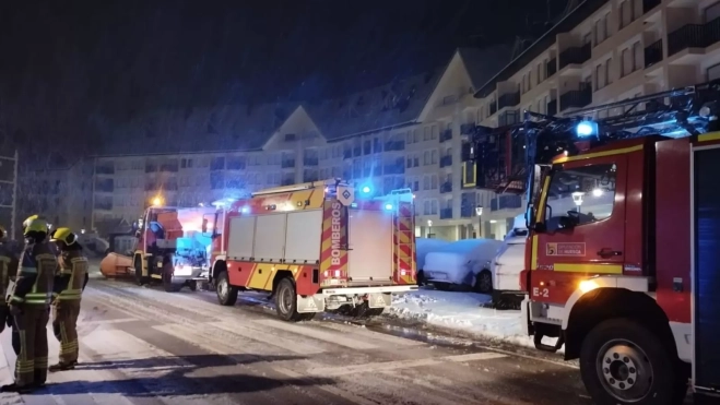 Efectivos del Speis de Sabiñánigo recibieron a la 1.00 horas, desde el 112, el aviso de un incendio a causa de una estufa de pellets en una vivienda de la plaza Europa de Canfranc.