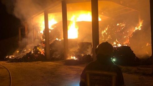 El fuego, declarado por causas que se desconocen, estaba especialmente focalizado en una nave que se utiliza como almacén de pacas de veza. En total, contenía 300 pacas con más de cien mil kilos de material combustible. Los bomberos han controlado la propagación de las llamas al entorno de la nave, compuesta de matorral y monte bajo, así como a los campos de cereal cercanos.