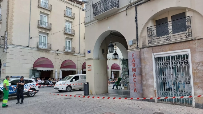 Un coche de la Policía Local se ha mantenido vigilante junto a la zona que ha sido precintada, entre el kiosco y el final de la antigua farmacia hasta que han llegado a retirar los cascotes que han sido derribados.