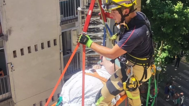 Durante la operación, un bombero se ancló junto a la ventana para asistir en la salida, mientras que otro, posicionado en el pasillo de la vivienda, sujetaba una cuerda para evitar el balanceo de la camilla. Desde los mandos de la plataforma, se tensaron las cuerdas para comenzar un descenso controlado en vertical, con el rescatador acompañando al paciente hasta llegar a la camilla de la ambulancia.