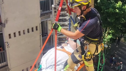 Se decidió evacuar al paciente por la ventana mediante la autoescala, una maniobra que requiere preparación y precisión. La camilla fue introducida por la ventana y se procedió al ajuste de cuerdas. Una vez asegurada, se trasladó al paciente desde la cama a la camilla, preparándolo para el descenso.