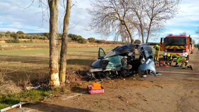 Los bomberos han rescatado de su vehículo a una mujer embarazada que ha chochado contra un árbol en Adahuesca. La accidentada de 38 años y vecina de la comarca del Somontano ha resultado herida grave y sido trasladada al hospital de Barbastro.