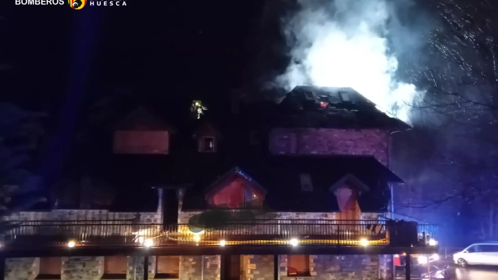 Los bomberos de la Diputación Provincial de Huesca de Sabiñánigo, Benabarre y Sariñena han intervenido esta noche en el incendio de un bloque de apartamentos en Escarrilla que se ha originado en la cubierta del edificio y ha acabado calcinando el techo de dos departamentos, ante el que ha habido que desalojar a las dos únicas personas que estaban en el inmueble.