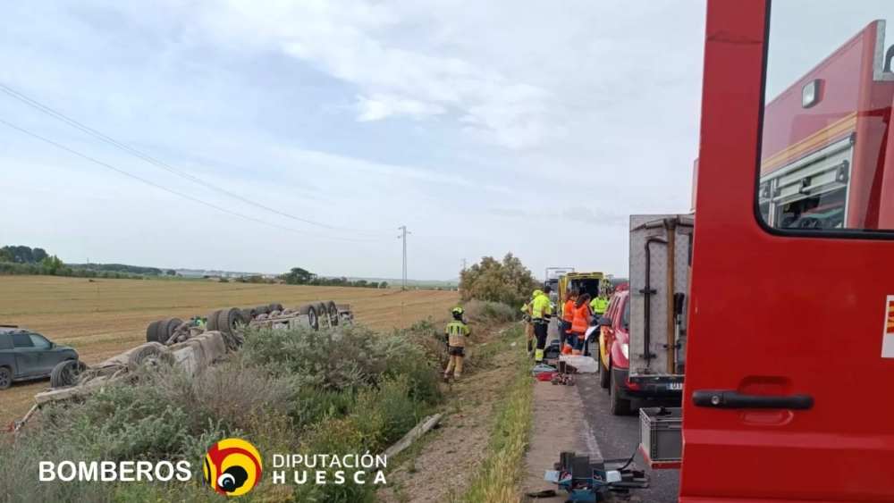 El aviso del accidente se ha comunicado a las 6.50 horas y hasta el lugar se han desplazado un oficial y tres bomberos del parque de Fraga, con el apoyo de dos efectivos del parque de Barbastro y un furgón de salvamento. El conductor, una vez liberado, ha sido evacuado a un centro sanitario.
