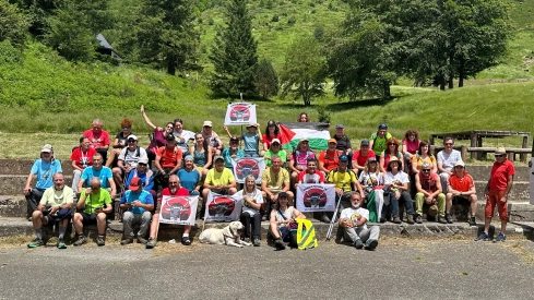 “Aquí nos tienen ustedes, en la frontera del Somport, culminando la penúltima etapa de la Marcha por Francia. Hoy hemos disfrutado de niebla refrescante, sol inclemente y almuerzo reconfortante. Ahora la "raca" embalsa los picos circundantes tras permitirnos disfrutar del paisaje alpino, de magníficas tucas como el Aspe.