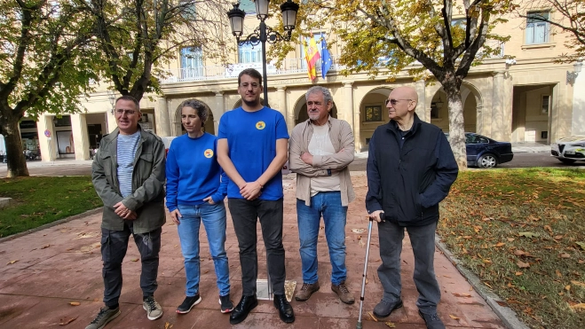 Jorge Pueyo, diputado de CHA por la coalición Sumar, y la alcaldesa de Biscarrués, Lola Giménez, acompañados por otros miembros de Chunta, han presentado la iniciativa este viernes en una rueda de prensa ante la Subdelegación del Gobierno en Huesca.
