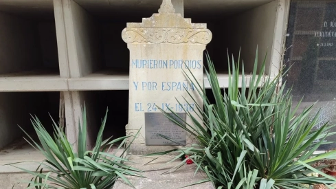 "En el cementerio de Sesa persiste un monumento con apariencia de tumba en la que una placa menciona a José Antonio Primo de Rivera y otros trece nombres bajo la inscripción “Murieron por Dios y por España el 24-IX-1936”, un claro ejemplo de símbolo que incumple la Ley 20/2022", señala CHA.