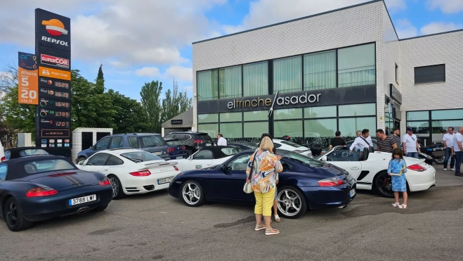 Propietarios de Porsche de Zaragoza, Navarra y Huesca (23 de nuestra ciudad y su entorno) han desayunado en el establecimiento aludido, se han saludado, abrazado y alegrado de estar un año más embelleciendo las carreteras. Hacia las 9:30, partida hacia Puente la Reina de Jaca como destino, pero, eso sí, buscando vistas magníficas en La Sotonera (Bolea, Puibolea...).