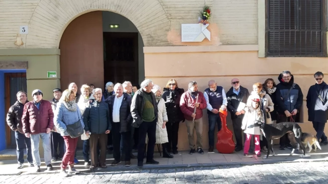 Unas treinta personas han acudido a la convocatoria del Colectivo Ciudadano de Huesca para conmemorar en la calle de Las Cortes, el vigésimo aniversario de la colocación de la Pajarita que recuerda en la casa de Ramón Acín y Concha Monrás la tragedia de su detención y asesinato en agosto de 1936.
