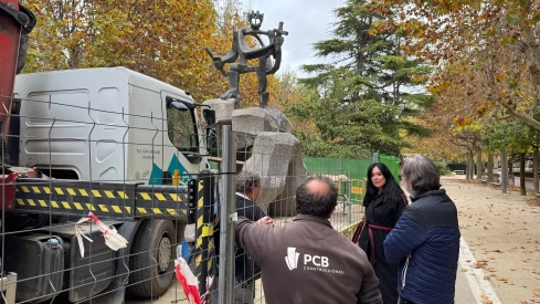 La empresa Piedra Casbi ha comenzado este miércoles los trabajos de reparación del pedestal de la estatua a la Cuna del Reino de Aragón en el Parque Miguel Servet de Huesca.