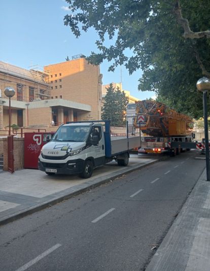 Un camión de MIAG (Montajes Industriales del Alto Gállego de Sabiñánigo) y una grúa de Losfablos han comenzado junto a varios operarios de ambas compañías los trabajos de reposición del tejado de la Iglesia de Santiago esta mañana del lunes.