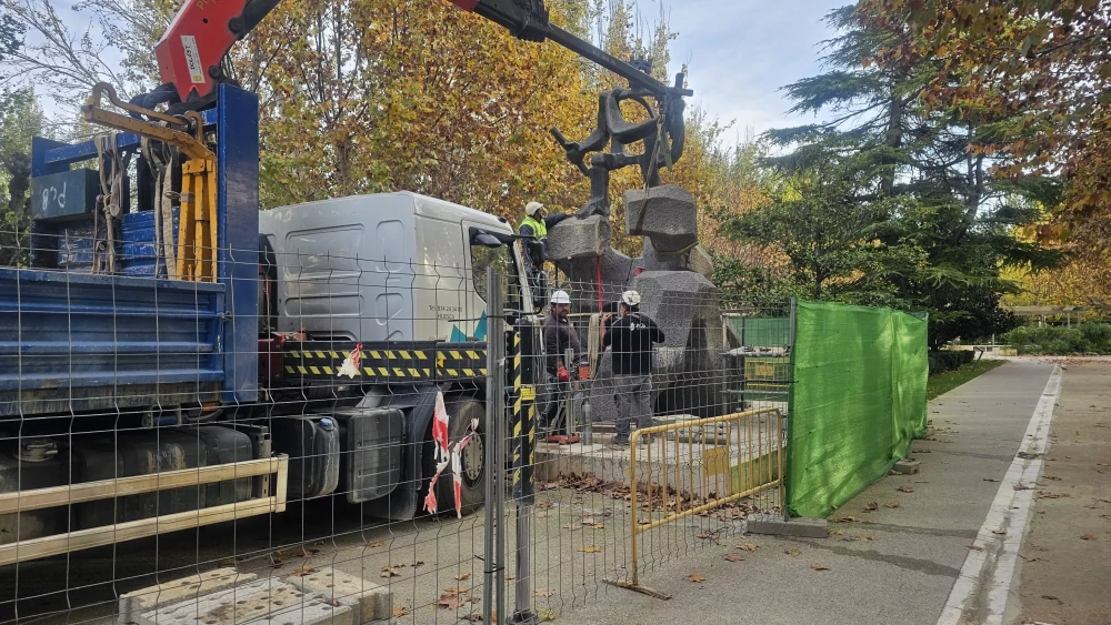 La empresa Piedra Casbi S.L. ha asumido la reparación como adjudicataria por un montante de 11.057 euros y esta mañana ya se veía la maquinaria y los operarios actuando sobre el monumento que en apenas dos años cumplirá medio siglo, y que fue donado por la Caja de Ahorros de Zaragoza, Aragón y Rioja, hoy Ibercaja.
