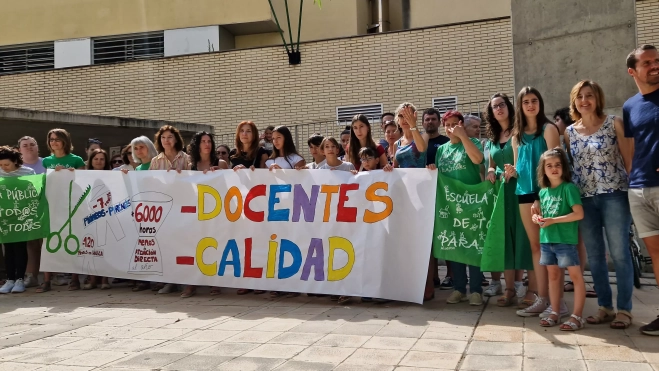 A las puertas del Colegio Público Pirineos-Pyrénées de Huesca se ha congregado este jueves medio centenar de personas, entre docentes, madres, padres y alumnado, para expresar su profundo descontento y preocupación ante los recortes educativos planificados por la consejería de Educación del Gobierno aragonés.