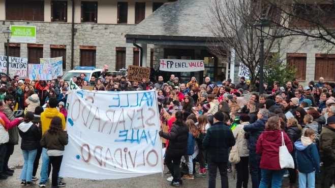 Miembros de la Comunidad Educativa del Valle de Benasque, que este domingo expresaron su malestar por los posibles planes de la administración autonómica, se han concentrado antes de que diera inicio este encuentro, para dar cuenta de su preocupación.