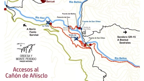 Está cortado para peatones el sendero que une los aparcamientos de La Tella y la Ereta de Bies y tampoco es posible el acceso al sendero "Circuito del Agua" en el tramo comprendido entre aparcamiento de la Ereta de Bies y la fuente de San Úrbez, a través de la pasarela del río Aso y el puente sobre el río Bellos.