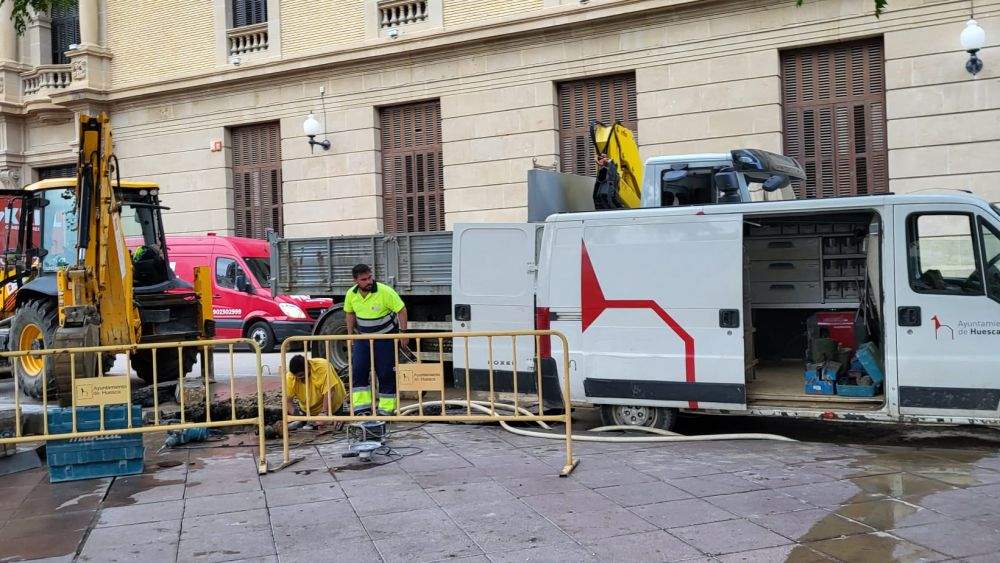 La avería en una boca de riego ubicada en la plaza de Navarra de Huesca ha llevado a un corte en el suministro desde las 15 horas de esta tarde.
