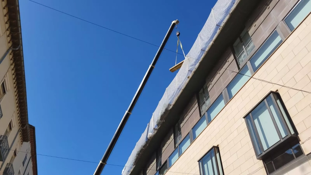 Los viandantes del centro de Huesca se han encontrado con la imposibilidad de caminar por los Porches de Galicia en el tramo central enfrente de la Diputación Provincial. Por eso del deporte nacional de disfrutar de las obras públicas, había unos cuantos esta mañana contemplando las elevaciones de los materiales a cargo de Grúas Losfablos.
