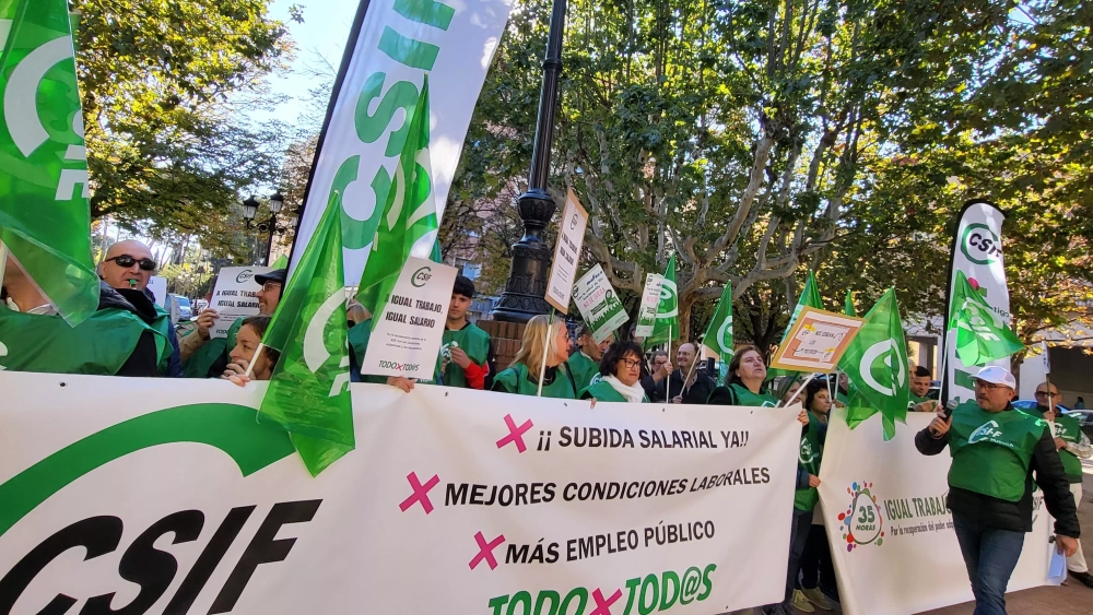 Delegados sindicales de Csif, uniéndose a la convocatoria nacional, han portado una pancarta a través de la que han reclamado subida salarial, mejores condiciones laborales y más empleo público, y otra con el lema “igual trabajo, igual salario”. Además, han coreado lemas como “no hay servicio público sin personal al frente”, “nos sobran los motivos” y “mutualismo, al borde del abismo, con la salud no se juega”.