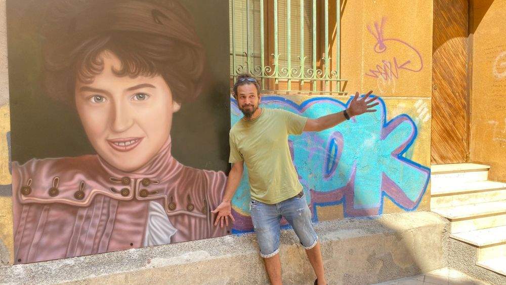 David Gatta, el barbastrense que ha saltado a la fama por sus hercúleos murales en Fraga, en Barbastro, en Fonz o en Salas Bajas, ha pintado una pieza pequeña para sus hábitos, inspirado por la propia promotora, Pilar Sancerni, que le sugirió la figura de Elvira Hidalgo. Una obra "pintada con mucho amor, como todas. Es pequeña en dimensión, pero no como obra". Cuando el autor planifica, se documenta. "Tengo memoria de pez y, por eso, me empapo de lo que pinto. Estudio el personaje, en este caso Elvira Hidalgo, una soprano aragonesa con un gran prestigio mundial. Luego escojo el color, que sume, y elijo un soporte dibón, un sandwich de PVC y aluminio, de tamaño de 1,50 por 2,10 que va atornillado a la pared. Pilar lo está decorando con plantas artificiales para dar más armonía y el resultado es de una gran belleza".