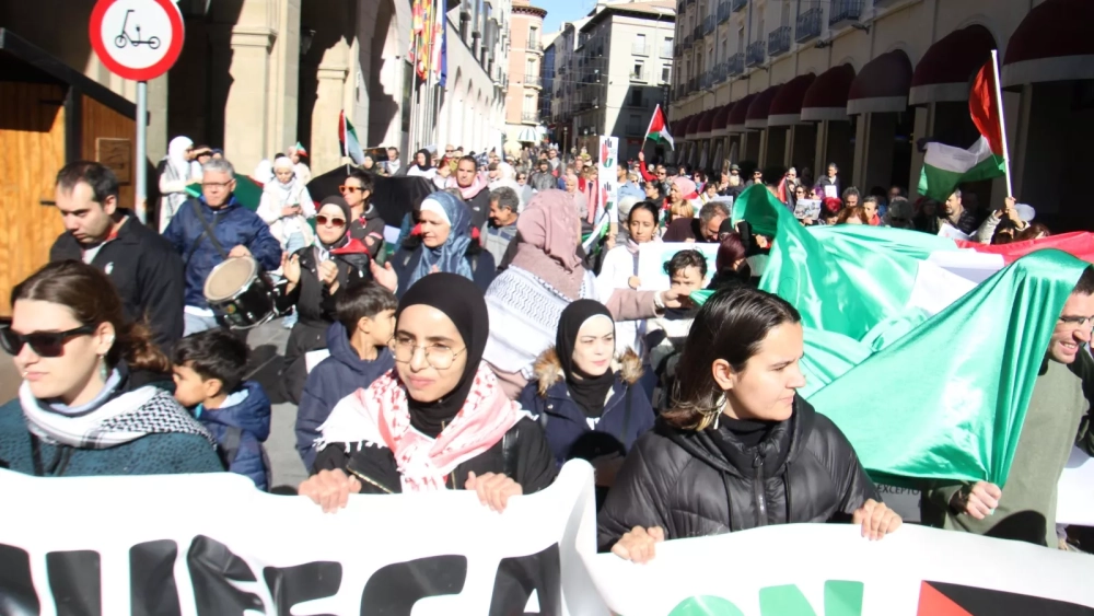 El punto de cita ha sido, como es habitual, la Plaza Santo Domingo de Huesca. Banderas de Palestina, alguna de extraordinario tamaño, y la ya veterana pancarta, curtida en infinidad de ocasiones precedentes, de la asociación convocante preceden a los manifestantes, en heterogénea amalgama.