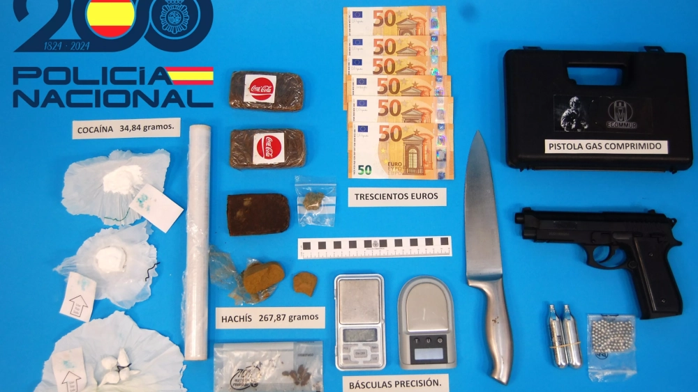 Los agentes solicitaron al Juzgado de Instrucción de Guardia el registro en su domicilio, localizando en el mismo una pistola de gas comprimido, 267 gramos de hachís, 34,84 gramos de cocaína y básculas de precisión.