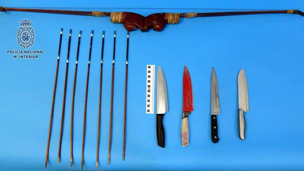 Los agentes desplazados hasta el lugar localizaron al hombre, quien huyó corriendo de la zona y cuando fue interceptado se resistió a la detención. Se le intervinieron un arco con siete flechas y cuatro cuchillos de cocina de grandes dimensiones.