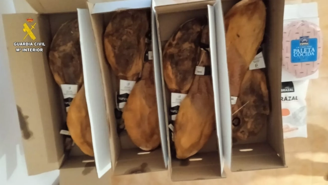 Fueron hallados en el interior del vehículo para su venta ocho jamones, una paleta cocida ibérica, un saco de cinco kilos de arroz, ocho décimos de lotería de navidad y 6.230 euros en efectivo. El valor total de los sustraído a lo largo del año ascendería a más de 10.000 euros.