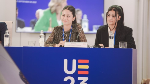 Las alumnas del IES Lucas Mallada de Huesca Nouria Tibari y Ana Bernués han sido la voz de los escolares ante los 27 ministros de Educación de la Unión Europea reunidos en Zaragoza. Ambas han presentado las conclusiones del evento “La UE en el aula”, que ha reunido a estudiantes aragoneses, y han instando a los ministros europeos a caminar todos juntos hacia la consecución de los objetivos marcados en la actividad.