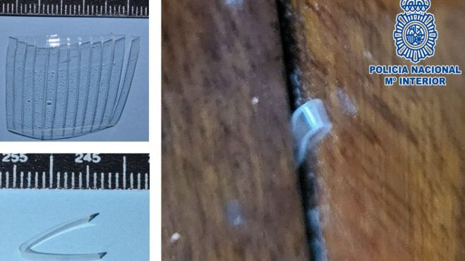 Los policías recuperaron los efectos que uno de los identificados había arrojado, que consistían en varias tiras de plástico utilizadas para el marcaje de puertas, y también localizaron más cuñas de este tipo escondidas en el forro interior de las prendas del segundo identificado.
