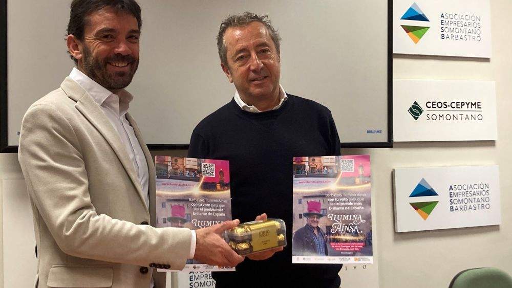 Nacho Bernad, responsable del área de comercio de la Asociación de Empresarios de Barbastro, y el alcalde de Aínsa, Enrique Pueyo, han presentado este jueves esta colaboración como una oportunidad única para “dar visibilidad no sólo a la población de Aínsa, sino también a todo nuestro territorio”.