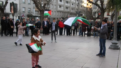 Los concentrados forman un círculo en cuyo centro niños y niñas de edades diversas ondean sin descanso banderas mientras se da lectura al manifiesto. El texto incide en ideas repetidas ampliamente: respeto a los derechos humanos, stop al genocidio y una paz justa para que pueda ser duradera.