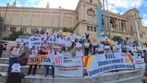 Cerca de un centenar de personas se han concentrado este sábado a las puertas del Museo Nacional de Arte de Cataluña (MNAC), en Barcelona, para exigir el cumplimiento de la sentencia para la devolución de las pinturas murales al Monasterio de Sijena. Con pancartas como "MNAC: ¡Cumple la sentencia ya! Devuelve las pinturas de Sijena sin más excusas" y "¿Museo o cárcel?", se ha dado lectura al Manifiesto de la Sociedad Aragonesa ante el MNAC, suscrito por cerca de una treintena de entidades.