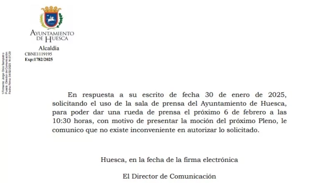De hecho, como consta en la fotografía que reproducimos, el 4 de febrero Jorge Orús envió el siguiente escrito al "Sr. Portavoz del Grupo Municipal VOX": "En respuesta a su escrito de fecha 30 de enero de 2025, solicitando el uso de la sala de prensa del Ayuntamiento de Huesca, para poder dar una rueda de prensa el próximo 6 de febrero a las 10:30 horas, con motivo de presentar la moción del próximo Pleno, le comunico quie no existe inconveniente en autorizar lo solicitado".