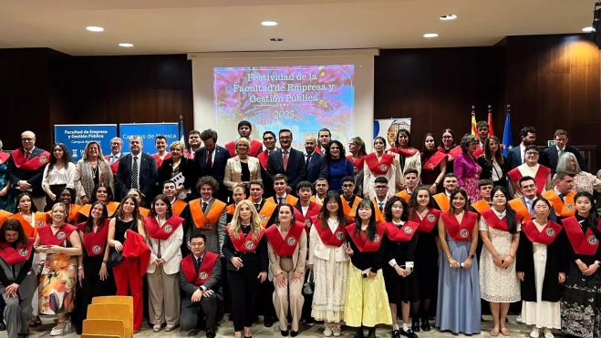 El acto tuvo lugar este pasado viernes en el aula magna del centro del campus de Huesca, en una ceremonia en la se celebró la graduación de los estudiantes de la promoción de 2025 y se entregaron distintos premios y reconocimientos al alumnado con expedientes destacados. Participaron junto a Bolea, la vicerrectora del Campus de Huesca, Marta Liesa, la decana de la Facultad, María Victoria Sanagustín, y los padrinos de las distintas promociones: Isaac Claver, presidente de la Diputación Provincial de Huesca, para el Máster en Dirección y Planificación del Turismo; Roque Vicente, presidente de la Comarca de Ribagorza, para el Grado en Gestión y Administración Pública; y Fernando Arguis, del Foro Empresarial Huesca Excelente, para el Grado en Administración y Dirección de Empresas (ADE).