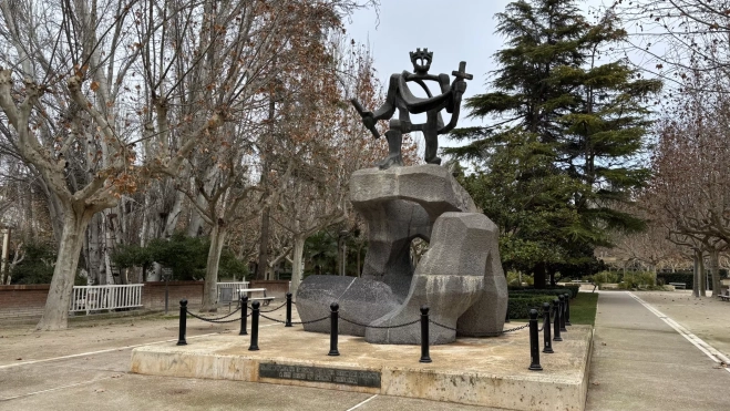 La empresa Piedra Casbi ha finalizado los trabajos en el monumento dedicado a la Cuna del Reino de Aragón, en el Parque Miguel Servet, que ha quedado protegido para evitar el acceso al pedestal.