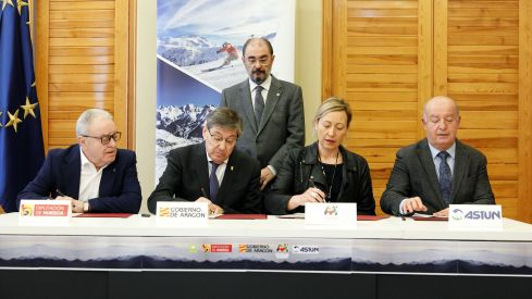 El acuerdo de colaboración ha sido firmado por el vicepresidente del Gobierno de Aragón, Arturo Aliaga, la presidenta del Consejo de Administración de Aramón, Marta Gastón, el presidente de la DPH, Miguel Gracia, y el director general de la Estación Invernal Valle de Astún, Jesús Santacruz, y se ha anunciado que en una o dos semanas se suscribirá el convenio para la unión de Candanchú y Astún.