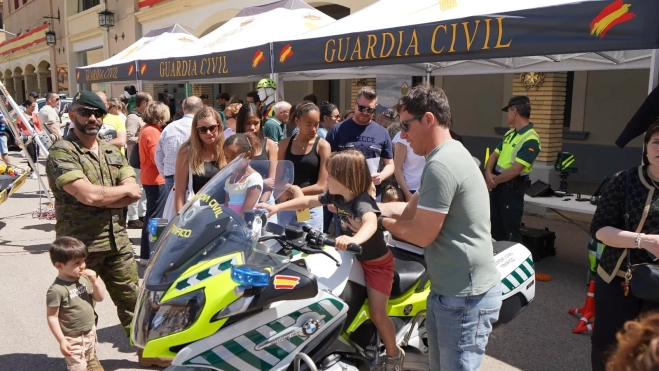 Durante cinco horas y todavía con el recuerdo de la magnífica interpretación de las seis bandas militares la tarde del sábado que emocionaron con los tonos del Dance de Espadas, los civiles han podido disfrutar de la amabilidad de los anfitriones castrenses con la exposición estática de materiales, las estaciones en las que se ha practicado la comunicación a través de la radio, enmascaramiento y colocación de equipo de combate, juegos cuarteleros y en la pista aplicación, y proyección de videos del Ejército de Tiera de las Unidades dependientes de la División Castillejos. También material de la Guardia Civil con las motos de tráfico en las que se han montado infinidad de niños.