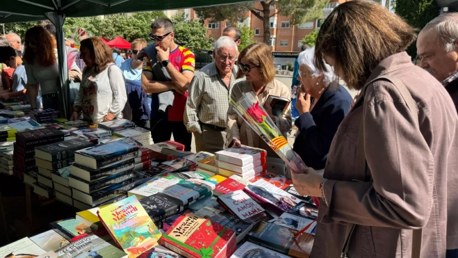 La Plaza de España se ha transformado en una gran librería donde adquirir todo tipo de ejemplares de literatura, así como rosas en el mercadillo de San Jorge organizado por la Concejalía de Cultura del Ayuntamiento de Binéfar para celebrar el Día de Aragón y del Libro.